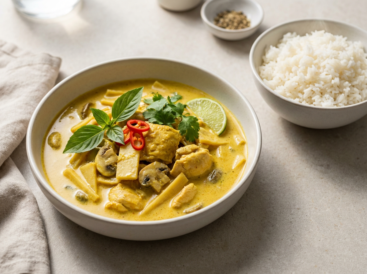 - Gelbes Thai Chicken Curry mit Bambus & Champignons, dazu Reis – 12,50 €