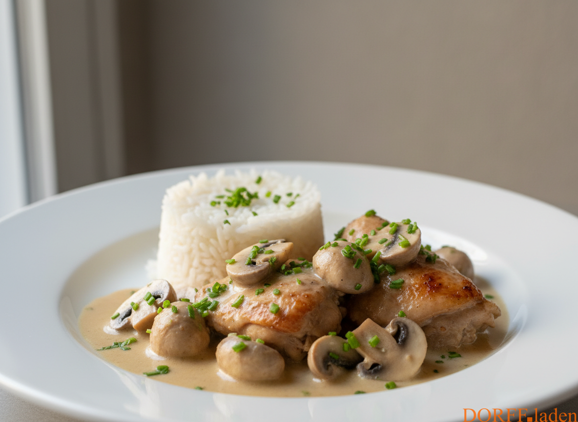 Coq au vin Blanc – Zartes Huhn in Weißwein-Rahmsauce mit Champignons und Reis (14,50 €) Allergene: 1,6,7,9,10,12 (Wein)